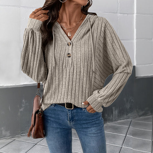 Casual and lazy style pit stripe hooded solid color knitted sweater top